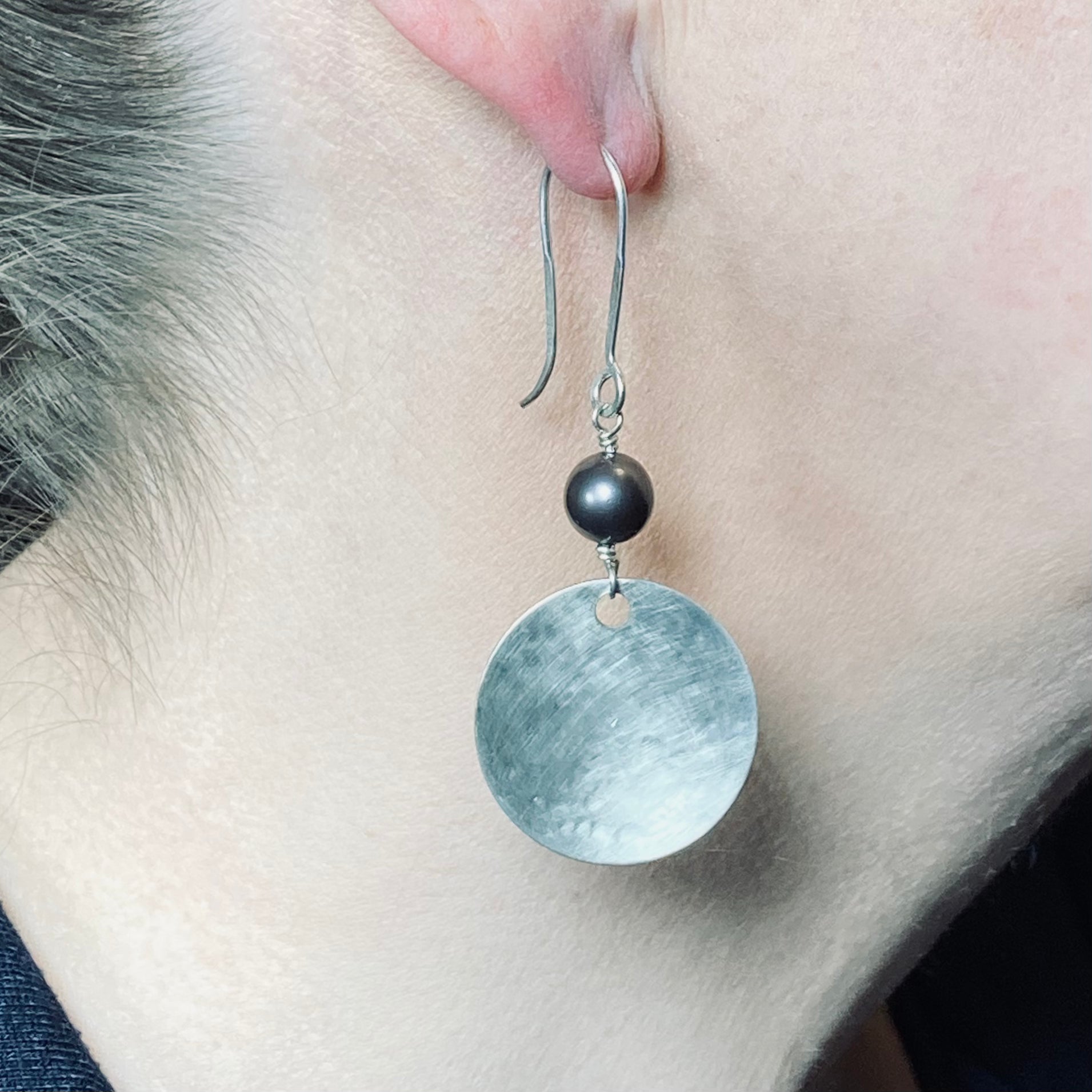 Sparkling dark gray freshwater cultured pearl (8mm) and hand hammered nickel silver disk (1"), artfully wired with sterling silver, dangle effortlessly from my signature hand forged sterling silver 20g ear wires