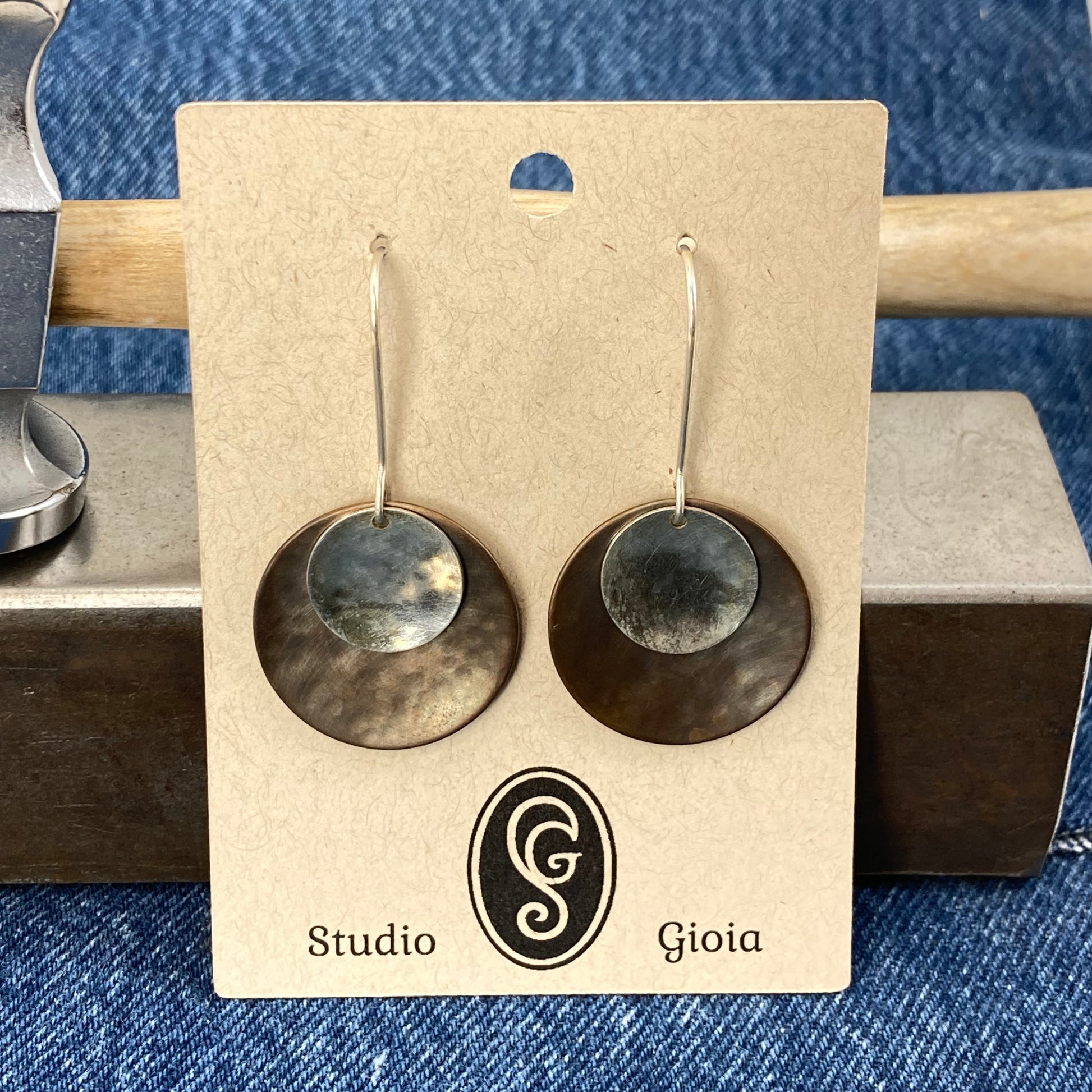 These stylish dangles feature a disk (3/4") of warm darkened and hand hammer bronze atop a hammered (1") disk of nickel silver, suspended by my signature hand formed ear wires of 20g sterling silver.